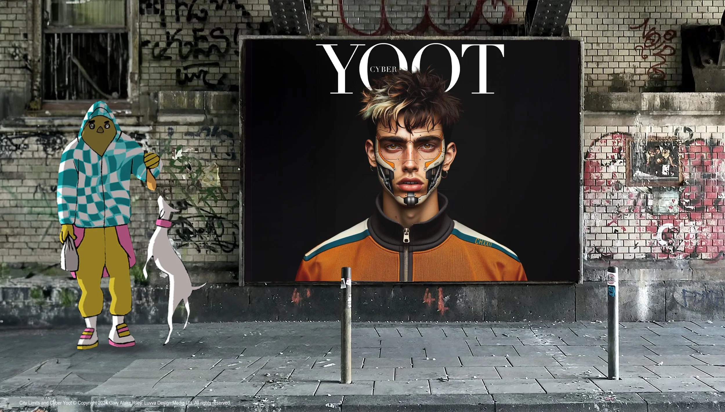 Concept image: CHXXII cyber-wear ad illustrating Cyber-Yoot™ in commercial media, from the City Limits animation series idea.