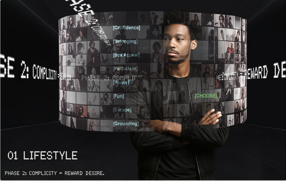 Immersed in a believable contemporary digital Ad. campaign, participants are urged to upgrade their wants and emotions. The pitch is smooth and recognisable — advertising at its most persuasive. Yet beneath the gloss and engineered FOMO, the undertone is authoritarian, urgent, and very seductive.